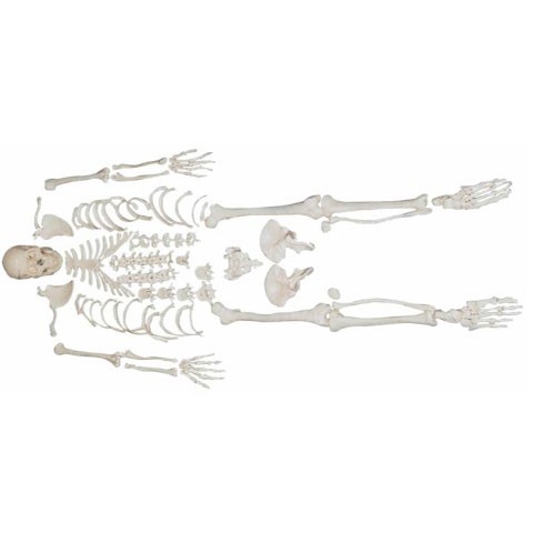 El esqueleto adulto desarticulado de tamaño natural incluye un cráneo de 3 partes, la mano derecha y el pie derecho sobre el alambre