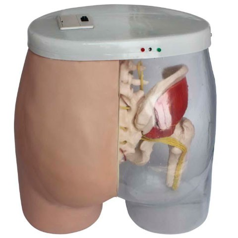 Este modelo con piel realista es perfecto para enseñar técnicas de inyección adecuadas y cómo evitar nervios y venas. · El lado derecho transparente del modelo muestra una estructura interna que incluye huesos, músculos, nervios y venas. · Se puede palpar el glúteo medio, los nervios, las venas, el ilion crista y el trocánter mayor para confirmar los puntos de inyección correctos.