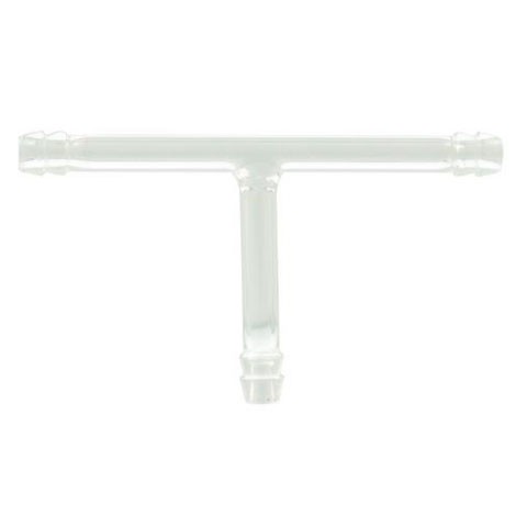 Elaborado en vidrio.· Forma de T.· Tres vías.· Extremo ondulado para tubos de goma de 8 mm de diámetro exterior.