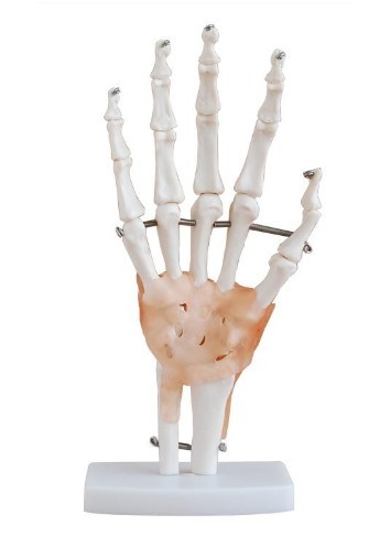 Demuestra toda la funcionalidad de la mano y las estructuras anatómicas externas. Incluya ligamentos artificiales flexibles. Fabricado en plástico PVC, tamaño natural.