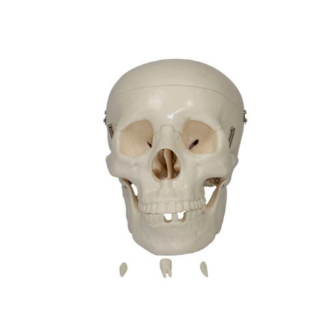 Este cráneo de adulto de tamaño natural presenta una mandíbula móvil, calvarium cortado, líneas de sutura y 3 dientes inferiores removibles: incisivo, canino y molar. Seccionado en 3 partes.