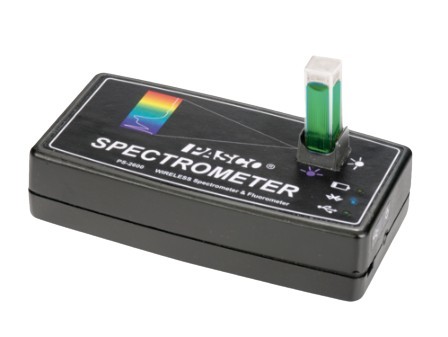 El espectrómetro inalámbrico PASCO galardonado está diseñado específicamente para laboratorios de enseñanza modernos. Se conecta a los dispositivos de los estudiantes a través de USB o Bluetooth Low Energy e incluye software de espectrometría gratuito con herramientas integradas para análisis espectral. Los tiempos de escaneo son rápidos, lo que permite a los estudiantes recopilar un espectro completo de datos en menos de un segundo. Se proporcionan parcelas integradas para aplicaciones comunes, incluyendo absorbancia versus longitud de onda, intensidad versus longitud de onda, absorbancia versus longitud de onda, Concentración (ley de Beer) y Absorbancia vs. Tiempo (cinética).