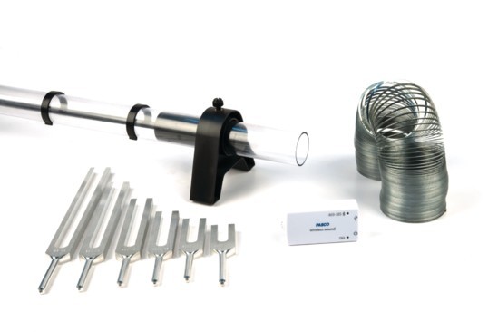 Este paquete incluye un sensor de sonido inalámbrico, una columna de aire de resonancia y accesorios utilizados para realizar una variedad de experimentos con ondas y sonido.