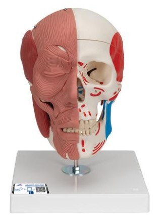 Codigo: 1020181-A300· Modelo básico del cráneo con musculatura facial. En la mitad derecha del cráneo de este modelo están representadas la musculatura de la cara y de la masticación.