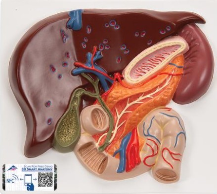 Codigo 1008550 VE315· Este excelente modelo en relieve muestra el sistema de conductos con:· Hígado· Vesícula biliar· Páncreas· Duodeno· Conductos· Conductos exta hepáticos con vesícula biliar.· Conducto principal pancreático y sus orificios.· Montado sobre soporte.