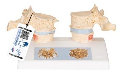 Un modelo idóneo para la formación médica y sesiones con el paciente. Las vértebras dorsales presentadas son las 11 y 12. En el lado izquierdo de la base se presentan las piezas correspondientes a las dos vértebras osteoporóticas con disco intervertebral comprimido. · El cuerpo vertebral superior está separado en el plano medio. La mitad vertebral fijada magnéticamente puede retirarse con facilidad para poder ver las secciones transversales. Asimismo permite reconocer perfectamente el hundimiento del cuerpo vertebral o pérdida de sustancia ósea durante la osteoporosis y como consecuencia de ella. Asimismo muestra alteraciones óseas degenerativas en forma de osteofitos. · En el lado derecho de la base se presentan, a modo de comparación, dos piezas iguales de vértebras sanas con disco intervertebral. La mitad del cuerpo vertebral superior también está fijada magnéticamente y puede retirarse. Las vértebras representadas se complementan con sendos adhesivo en la base que muestran dos imágenes tridimensionales micro-CT obtenidas mediante biopsia ósea. · Las imágenes muestran claramente la micro arquitectura del hueso osteoporótico y su reducida densidad ósea en comparación con la de un hueso sano.· · Ahora cada modelo anatómico de 3B Scientific incluye GRATIS estas características adicionales:· · Acceso gratuito al curso de anatomía 3B SMART ANATOMY, alojado en la galardonada app Complete Anatomy de 3D4Medical· El curso 3B SMART ANATOMY consta de 23 ponencias digitales sobre anatomía, 117 modelos anatómicos virtuales distintos y 39 cuestionarios de anatomía para probar su nivel de conocimientos.· Además: Extensión de garantía GRATUITA de 3 a 5 años con cada registro del producto.· EXTRA: también obtendrá acceso a una prueba gratuita de tres días de todas las características premium de la app Complete Anatomy al inscribirse en el curso 3B SMART ANATOMY.· · Para acceder a estas ventajas, escanee la etiqueta que aparece en su modelo y regístrese en línea. Todas las características de 3B SMART ANATOMY son totalmente gratuitas. · https://www.youtube.com/watch?v=KnbWPR7pb117