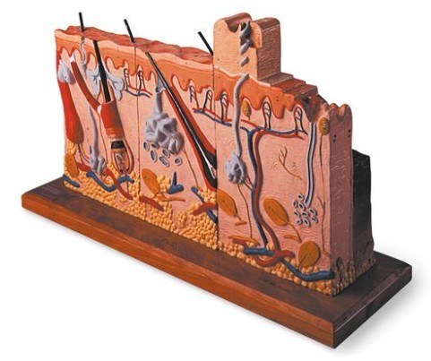 Codigo 1005549 W42533· Seis modelos en uno. La cara frontal compara y contrasta una piel saludable normal desde tres regiones del cuerpo diferentes: la palma de la mano o la planta del pie (totalmente sin vellos), la axila o sobaco (con pocos vellos) y el cuero cabelludo (completamente lleno de vellos).