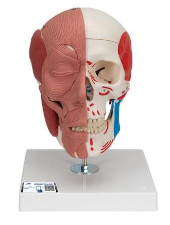 Modelo básico del cráneo con musculatura facial. En la mitad derecha del cráneo de este modelo están representadas la musculatura de la cara y de la masticación.