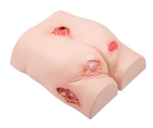 · El entrenador de tratamiento de úlceras por presión presenta una estructura en material flexible que le atribuye un mayor realismo a la práctica de sustitución y aplicación de vendajes adhesivos, un aspecto habitual del cuidado de enfermos y de heridas. El entrenador permite practicar con los estadios de úlcera por presión siguientes: